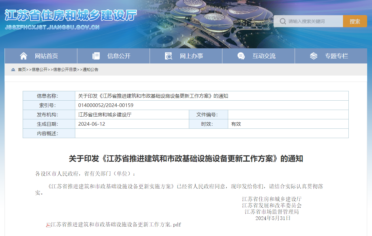 《方案》明确重点工作任务包括供水设施设备更新改造,污水处理设施设备更新,燃气、供排水管道老化更新改造,环卫设施设备更新,推进城市生命线安全工程建设,既有建筑节能改造等共11项任务。