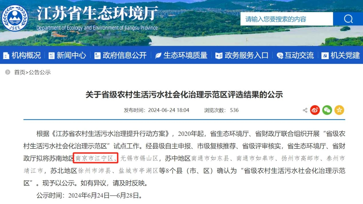 近期,江苏省生态环境厅发布《关于省级农村生活污水社会化治理示范区评选结果的公示》,全省8个县(市、区)荣获“省级农村生活污水社会化治理示范区”称号。南京市江宁区位列其中。这一荣誉表彰,是对江宁区在农村污水治理提升行动的肯定。